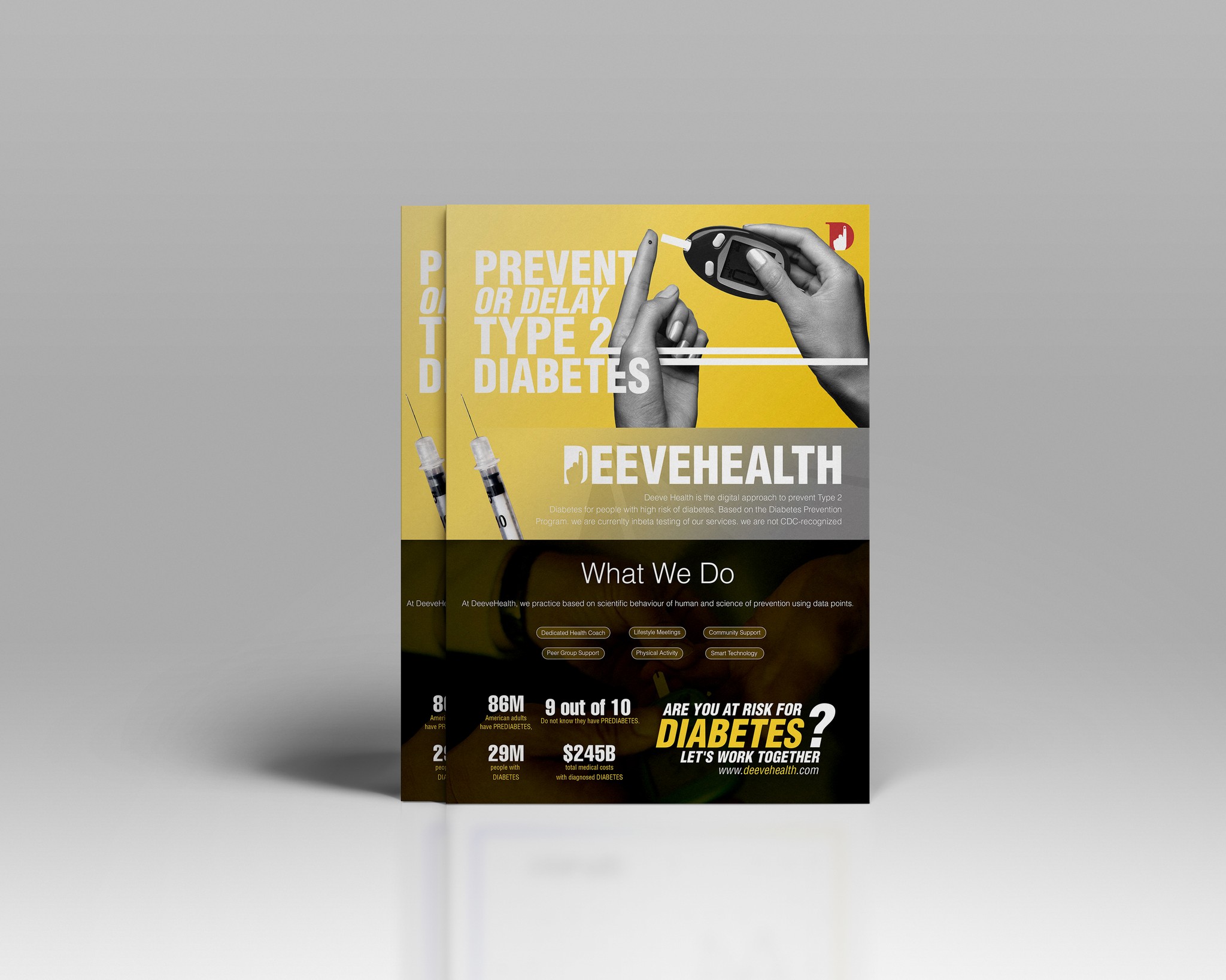 To address DeeveHealth’s branding and outreach needs, we designed a clean, responsive website that clearly communicated the program’s benefits, integrated behavior-tracking tools, and encouraged peer support. Alongside, we created a distinctive logo that represented balance and health transformation. Finally, we developed print-ready flyers that were informative, visually appealing, and actionable—serving as a tool for both awareness and enrollment. These deliverables positioned DeeveHealth as a trusted ally in the prevention of Type 2 Diabetes.
